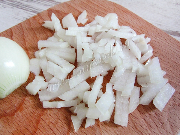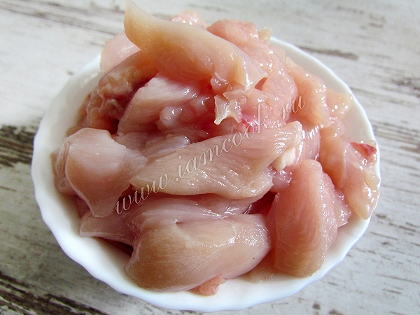 Отделите куриное филе от костей и кожи. Промойте филе, просушите и нарежьте небольшими кусочками.
