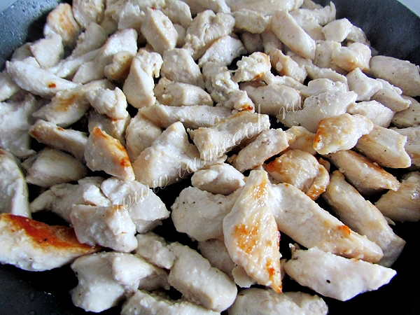 Обжарьте куриное мясо на хорошо разогретом растительном масле до золотистой корочки.