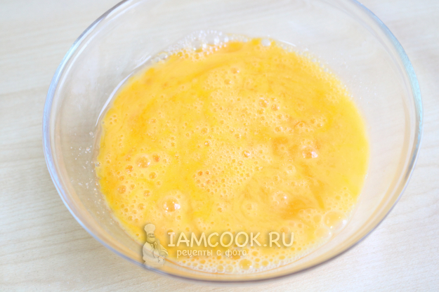 Тем временем в миску вбиваю яйца, подсаливаю, взбиваю вилкой до однородности.