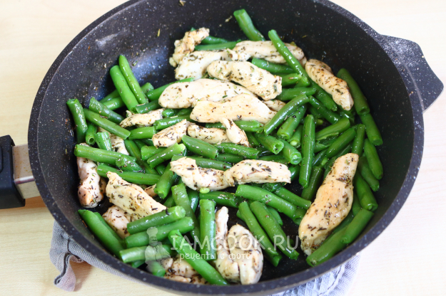 После чего выкладываю бланшированную стручковую фасоль и обжариваю всё вместе ещё минуты 2-3.