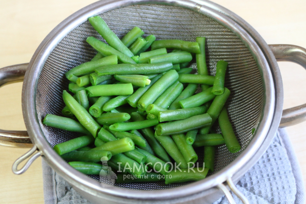 Замороженную стручковую фасоль бланширую в кипящей подсоленной воде пару минут.