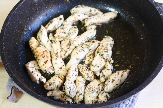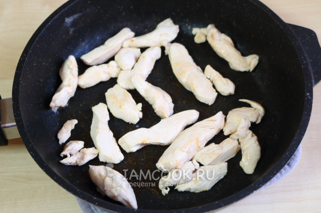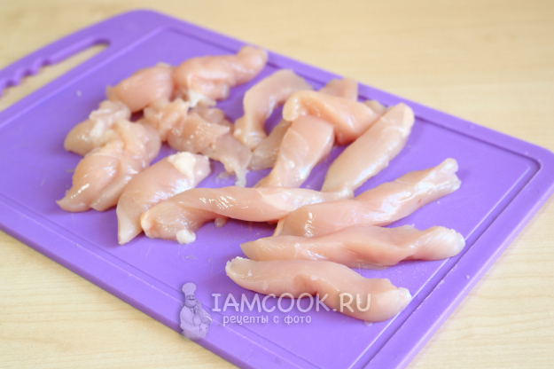 Куриное филе промываю и нарезаю на небольшие брусочки.