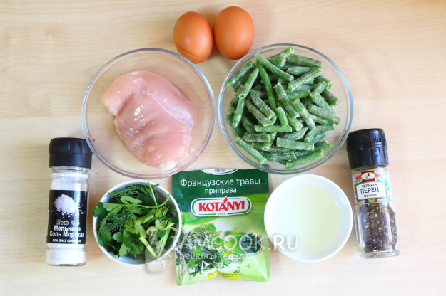 Для приготовления стручковой фасоли с курицей и яйцом на 2 порции возьмём следующие ингредиенты.
