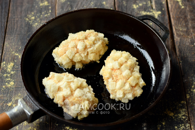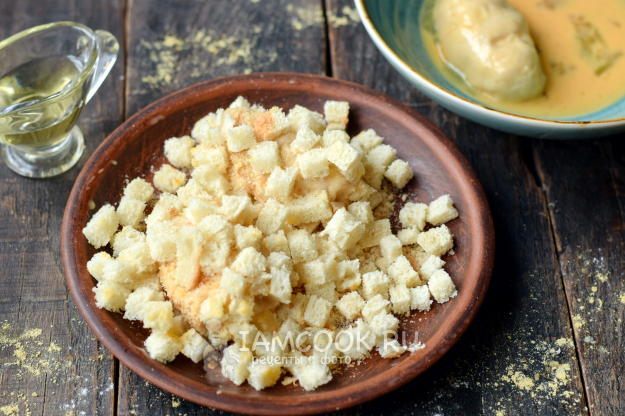 Мякоть батона нарежьте небольшими ровными кубиками, смешайте их с измельченными панировочными сухарями. Заготовки после яичной смеси запанируйте в хлебных кубиках.