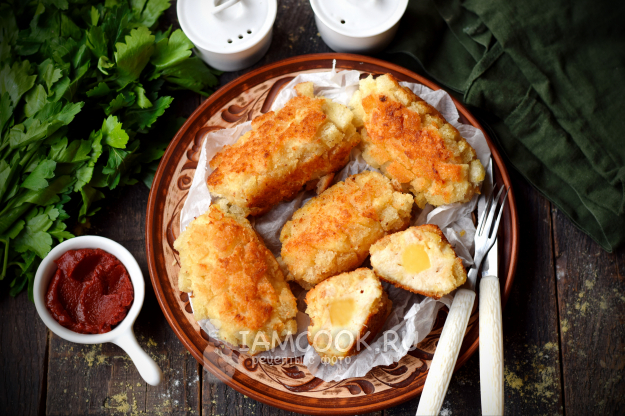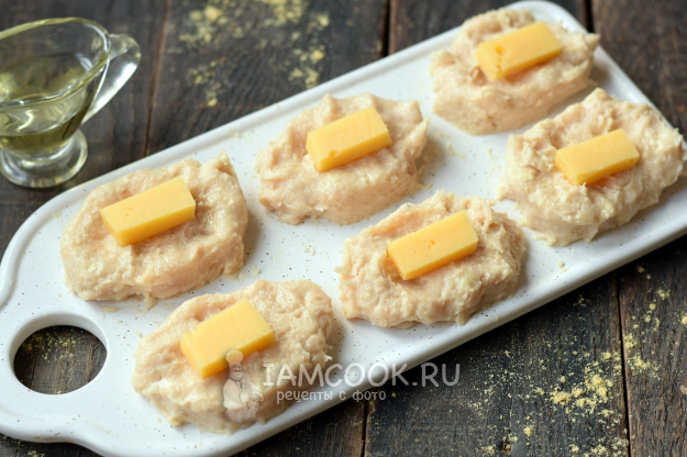 Сформируйте лепешки примерно одинакового размера и формы. В середину каждой лепешки уложите по брусочку твердого сыра.