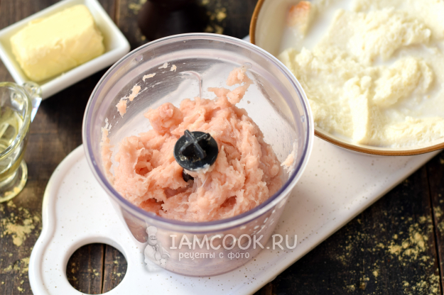 Куриное филе освободите от пленки и прожилок, нарежьте небольшими кусочками. Потом перебейте в блендере или пропустите через мясорубку.