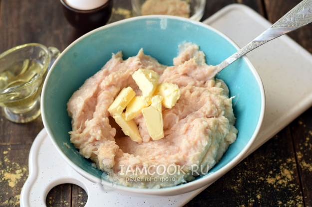 Фарш вместе с хлебом еще раз перебейте блендером, чтобы компоненты максимально соединились между собой. В полученную смесь добавьте мягкое сливочное масло, тщательным перемешиванием распределите его по фаршу. Массу присыпьте солью и молотым перцем по вкусу.