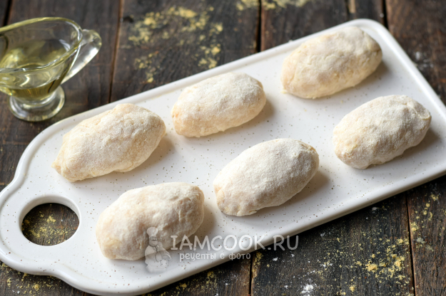 Сверните лепешки в калачики, оставляя сыр внутри. Каждый экземпляр запанируйте в муке.