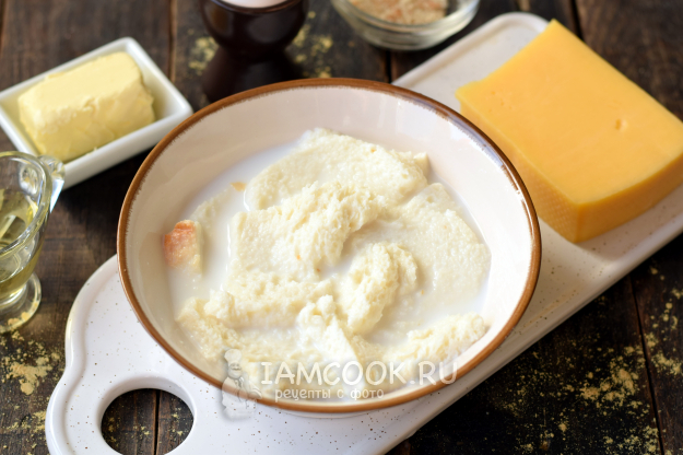 Мякоть батона (80 г) поломайте произвольными кусками, уложите в глубокую емкость, залейте сливками, отставьте в сторону.