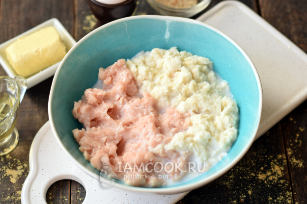 Куриный фарш соедините с размякшей в сливках мякотью батона.