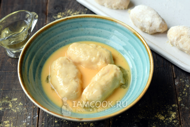 Яйцо расколотите вилкой, добавьте 1 ст.л. сливок или воды, посолите, перемешайте. В яичную смесь поочередно опустите запанированные в муке заготовки.