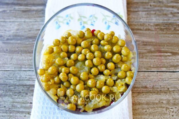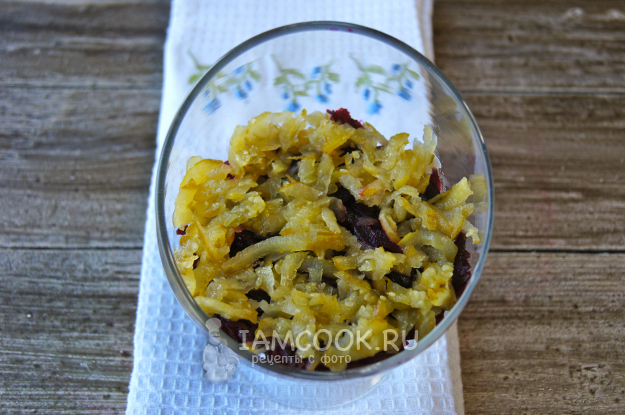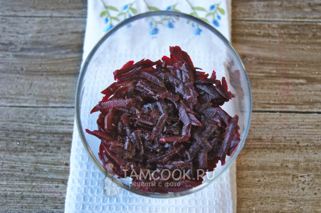 Остудите, очистите, натрите свеклу на крупной терке и выложите в салатник.