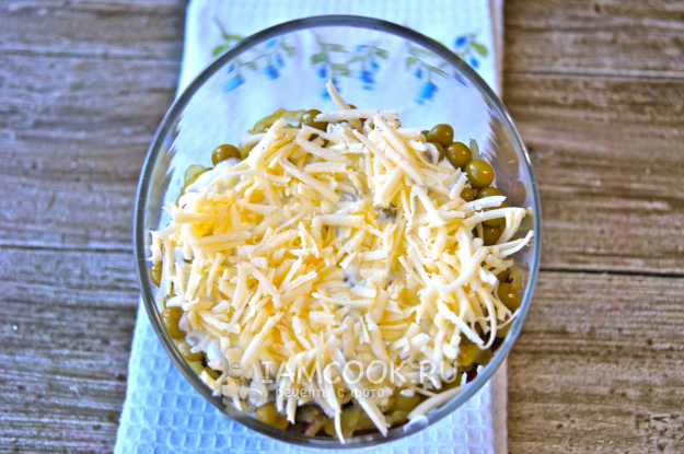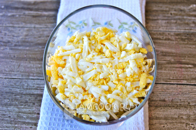 Яйца натрите на крупной или мелкой терке и выложите на сыр.