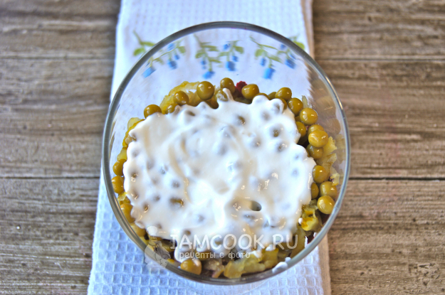 В майонез добавьте давленый чеснок по вкусу и смажьте горошек.