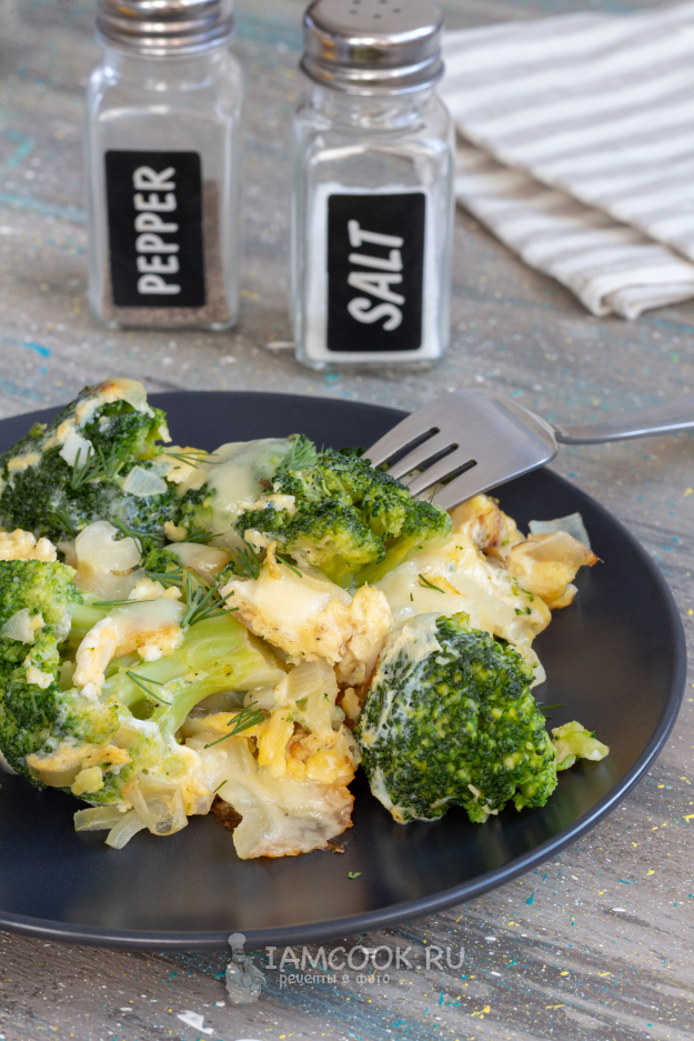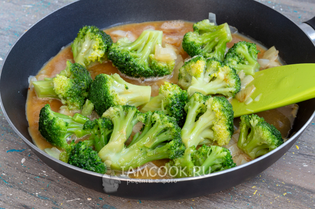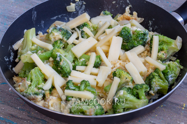 К обжаренному луку вливаем яйца и кладем отваренную брокколи. Жарим, периодически перемешивая, до момента, когда яйца схватятся.