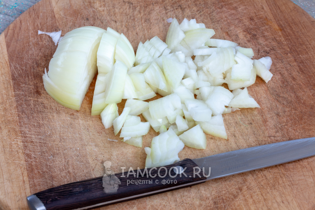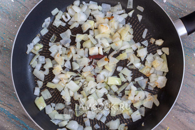 Кладем лук на сковородку с небольшим количеством растительного масла и обжариваем до прозрачности.