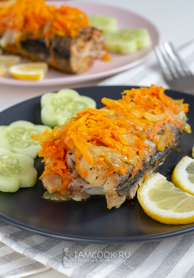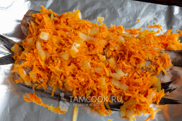 Выкладываем овощи на рыбу и заворачиваем в фольгу. Запекаем минтая с луком и морковью в духовке в фольге 30 минут при температуре 200°C.