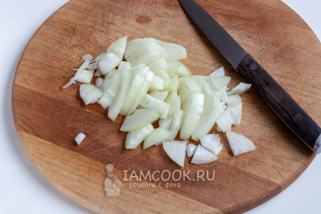 Теперь займемся овощами. Режем лук кубиками, ну или как вам больше нравится.