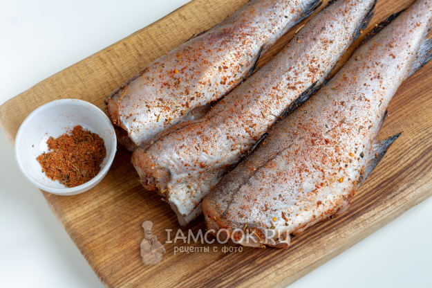 Подготовку закончили, теперь приступаем к приготовлению. Рыбу натираем любимыми специями с солью и откладываем в сторонку.