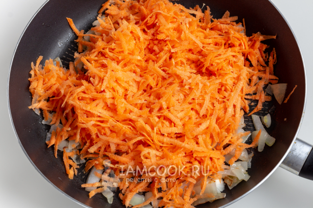 Пока лук обжаривался, я натерла морковь (надеюсь, вы тоже). Добавляем тертую морковь к луку. Слегка обжариваем вместе с луком. Солим и перчим морковь с луком по вкусу.