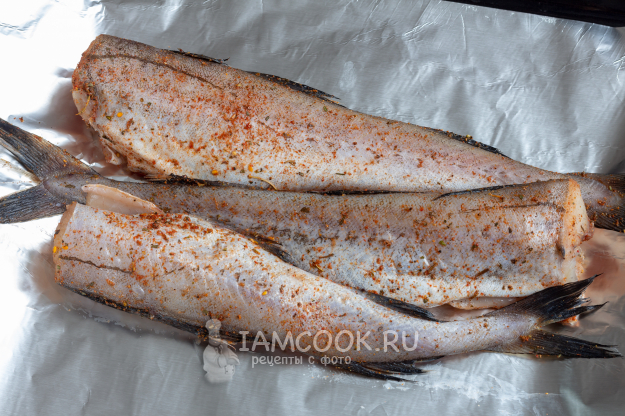 Теперь снова вспоминаем про минтая и перекладываем его на фольгу, так, чтобы можно было потом полностью завернуть рыбу в фольгу.