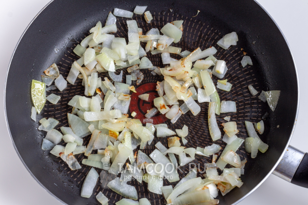 Разогреваем сковороду и обжариваем лук с добавлением небольшого количества масла до полупрозрачности.
