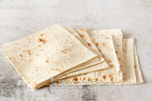 Лаваш или пшеничный ролл, как у меня, разрежьте на одинаковые квадраты. Их величина зависит от того, какой конечный размер конвертиков вы хотите получить. Данные квадраты - примерно 15х15 см.