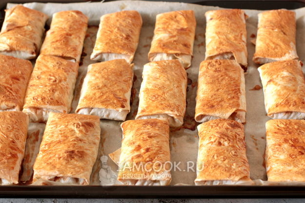 Выпекайте конвертики из лаваша с курицей 20-25 минут, до румяного цвета. Температура духовки - 190-200 градусов. Не волнуйтесь, фарш прекрасно успеет приготовиться, а лук полностью растворится в начинке, зато начинка получится сочной и вкусной.