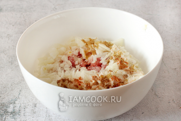 Добавьте соль и специи, хорошенько перемешайте. Если фарш получился суховатым, то влейте пару-тройку ложек кипяченой воды. Я ничего больше не добавляла.