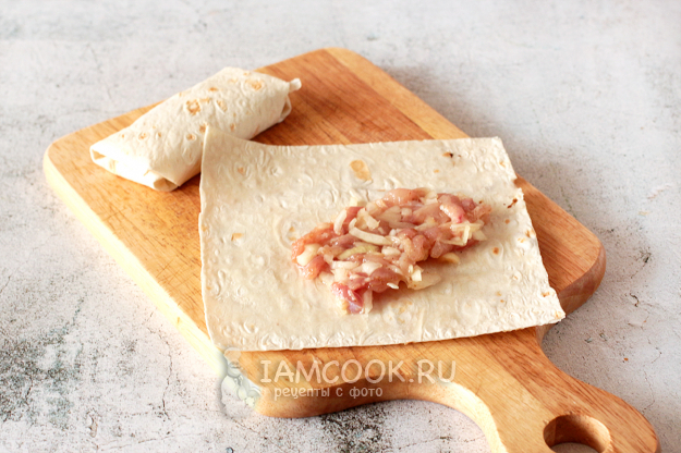 Сверните лаваш конвертиком, заворачивая края внутрь.