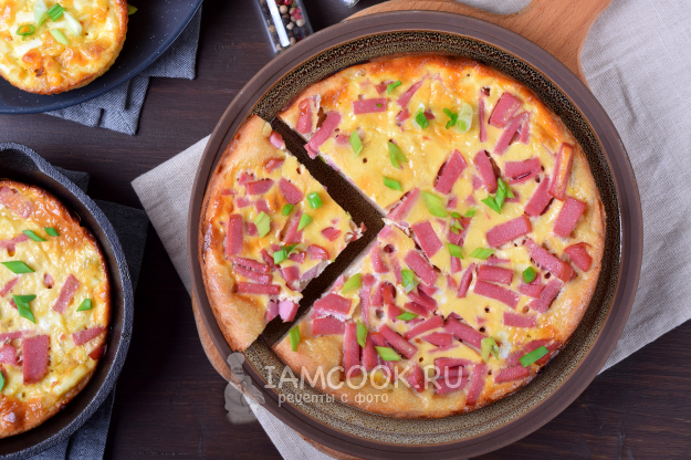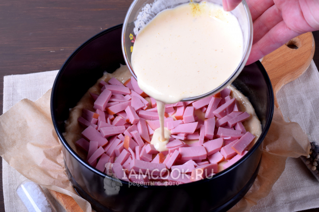 На тесто выкладываем нарезанную колбасу или начинку с луком и яйцом, и заливаем яично-сметанной смесью, распределяя ее ложкой по поверхности.