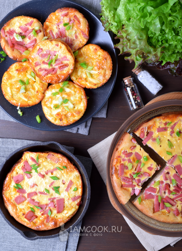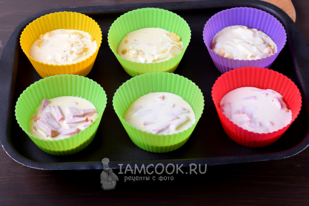 Также можно испечь смаженку в виде порционных изделий. Для этого распределяем тесто в формочках для выпекания кексов, выкладываем начинку и заливаем смесью яйца и сметаны.