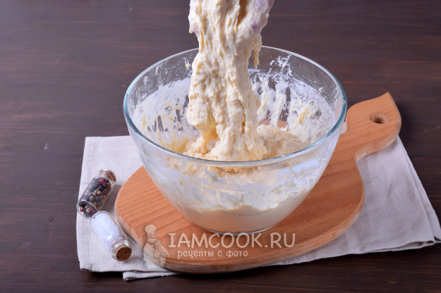 Завершим замешивание руками. Тесто получилось немного комковатым, очень липким, не держащим форму. Накроем миску с тестом и оставим при комнатной температуре на 30 минут.