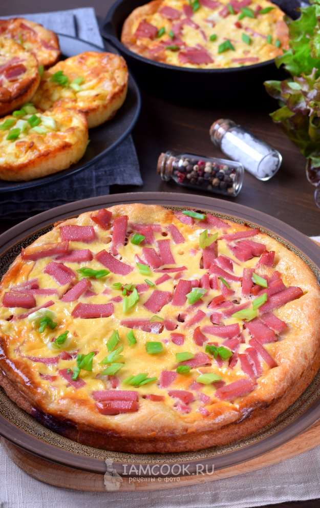 Подготовим ингредиенты для смаженки на кефире и начнем. Я предлагаю испечь два вида начинки: первая - это вареная колбаса, и вторая - вареное яйцо с пассерованным репчатым луком. Ну, а заливка будет одна для всех вариантов.