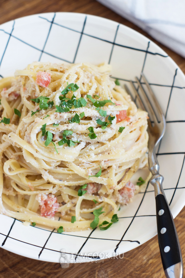 Лапша с ореховым соусом готова! Подавайте блюдо сразу же после приготовления, посыпав измельченной петрушкой и тертым пармезаном.