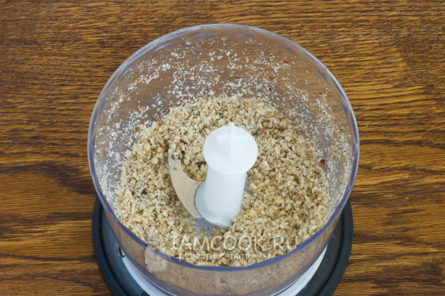 Грецкие орехи измельчите при помощи блендера в мелкую крошку.
