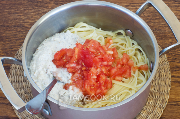 Отварите лапшу до готовности согласно инструкции на упаковке. Соедините готовую лапшу с ореховым соусом и помидорами, нарезанными мелкими кубиками.