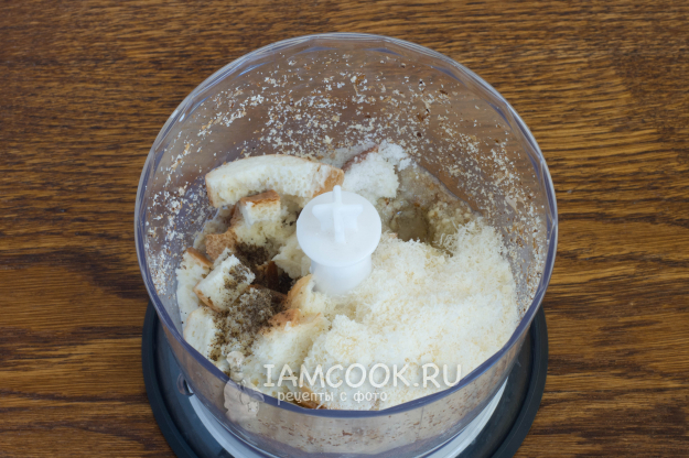 Добавьте замоченные сухарики вместе с молоком, натертый пармезан, растительное масло, немного соли и черного молотого перца.