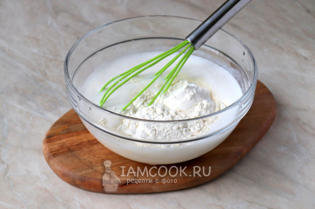 Венчиком размешайте, чтобы не осталось ни одного мучного комочка. В самом конце добавьте растительное масло. Накройте миску кухонным полотенцем и оставьте на 15-20 минут при комнатной температуре.