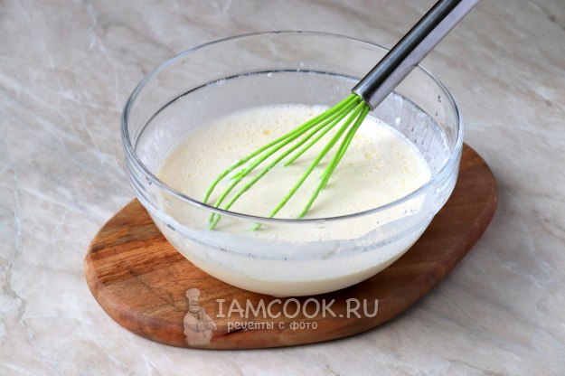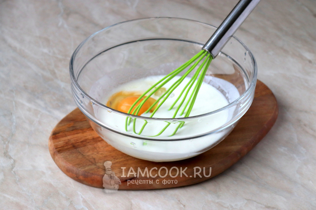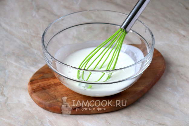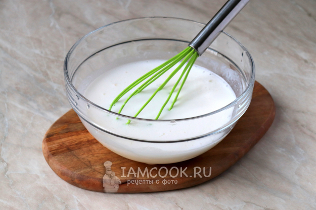 Кефир комнатной температуры налейте в глубокую миску, добавьте соду. Тщательно перемешайте, чтобы кисломолочный продукт погасил соду и масса вспенилась.