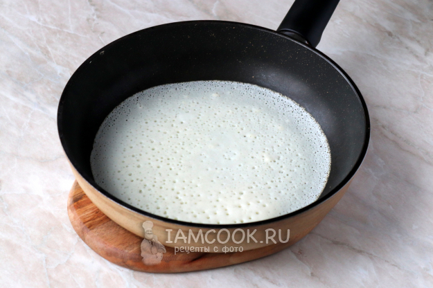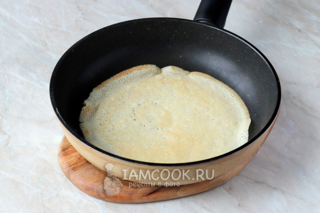 Тем временем раскалите подходящую сковороду (желательно с антипригарным покрытием) и в центр налейте порцию теста. Круговыми движениями сковороды распределите его по всему дну.