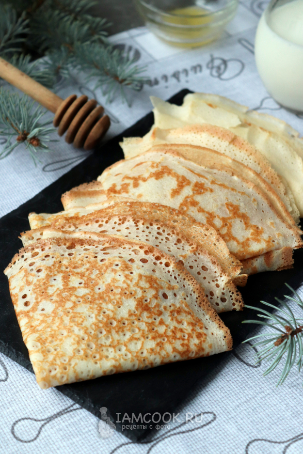 Вот и всё, очень вкусные, ажурные блины, замешанные на минералке и кефире, готовы. На стол подавайте в тёплом виде с мёдом, вареньем или сгущённым молоком.