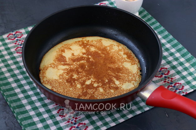 Затем блинчик перевернуть и обжарить с другой стороны. Растительное масло также можно добавить в тесто.