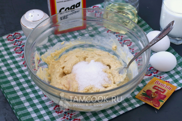 В тесто добавить соду и соль, перемешать и влить яичную смесь. Ещё раз хорошо перемешать. Тесто получится жидким.