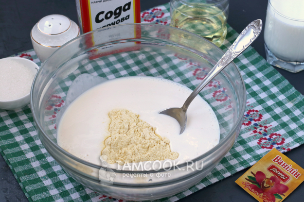 В глубокую миску просеять кукурузную муку, добавить ряженку и хорошо перемешать.