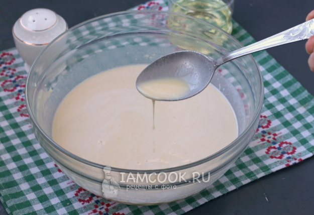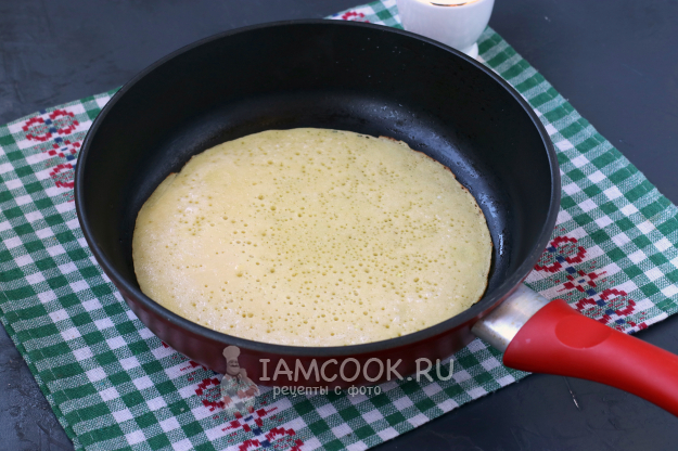 Сковороду хорошо разогреть, смазать растительным маслом. Половником наливать на сковороду тесто, чтоб оно покрыло всю поверхность. Жарить блинчик, пока на поверхности не останется влажных участков.