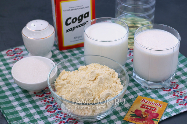 Для приготовления блинов из кукурузной муки на ряженке и молоке подготовить из списка необходимые ингредиенты.