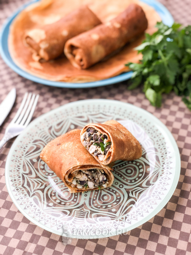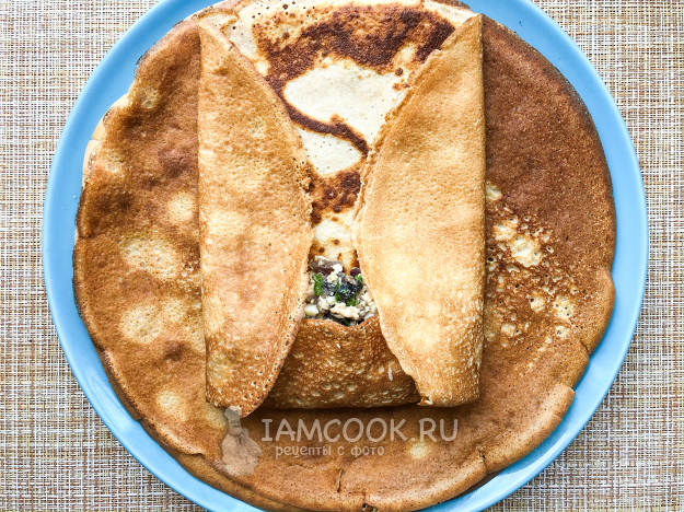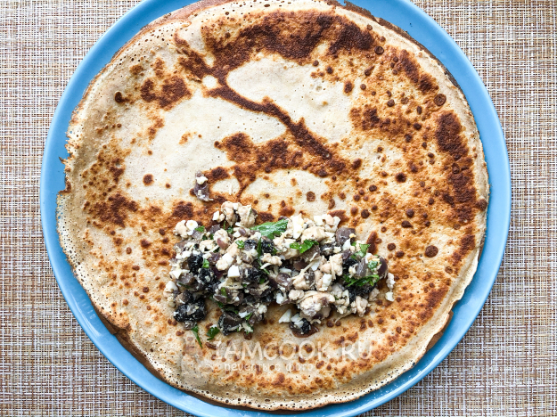 Блины из цельнозерновой муки с индейкой и грибами готовы. Приятного аппетита.