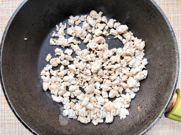 Филе индейки измельчите в фарш с помощью блендера или мясорубки. Обжарьте на подсолнечном масле до золотистой корочки, постоянно помешивая. Далее выложите фарш в тарелку с грибами и луком.