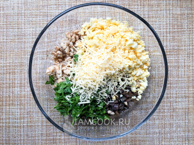 Добавьте измельченную петрушку, яйца, натертый на мелкой терке сыр и соль. Все тщательно перемешайте.